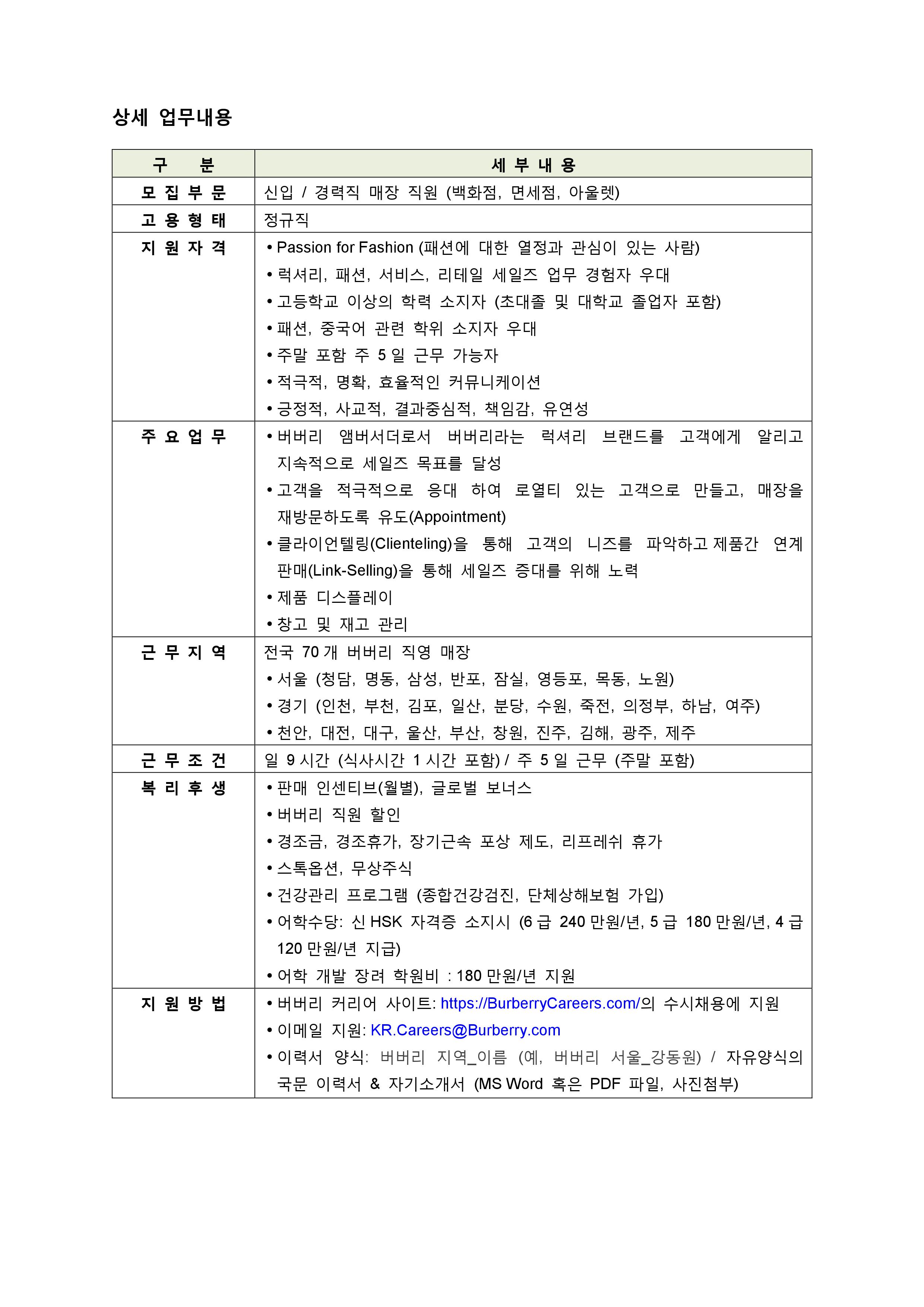 | 제목 | (~2/10)[버버리코리아]Sales Associate 백화점, 면세점, 아울렛 근무 신입/경력 채용 안내 | ||||