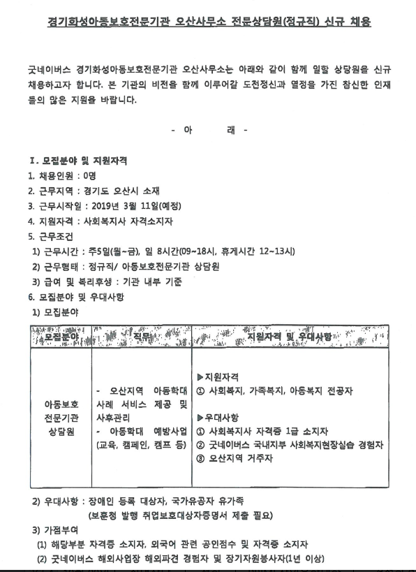 (~2/27)경기화성아동전문보호기관 오산사무소 전문상담원(정규직)신규 채용 안내 글의 상세내용