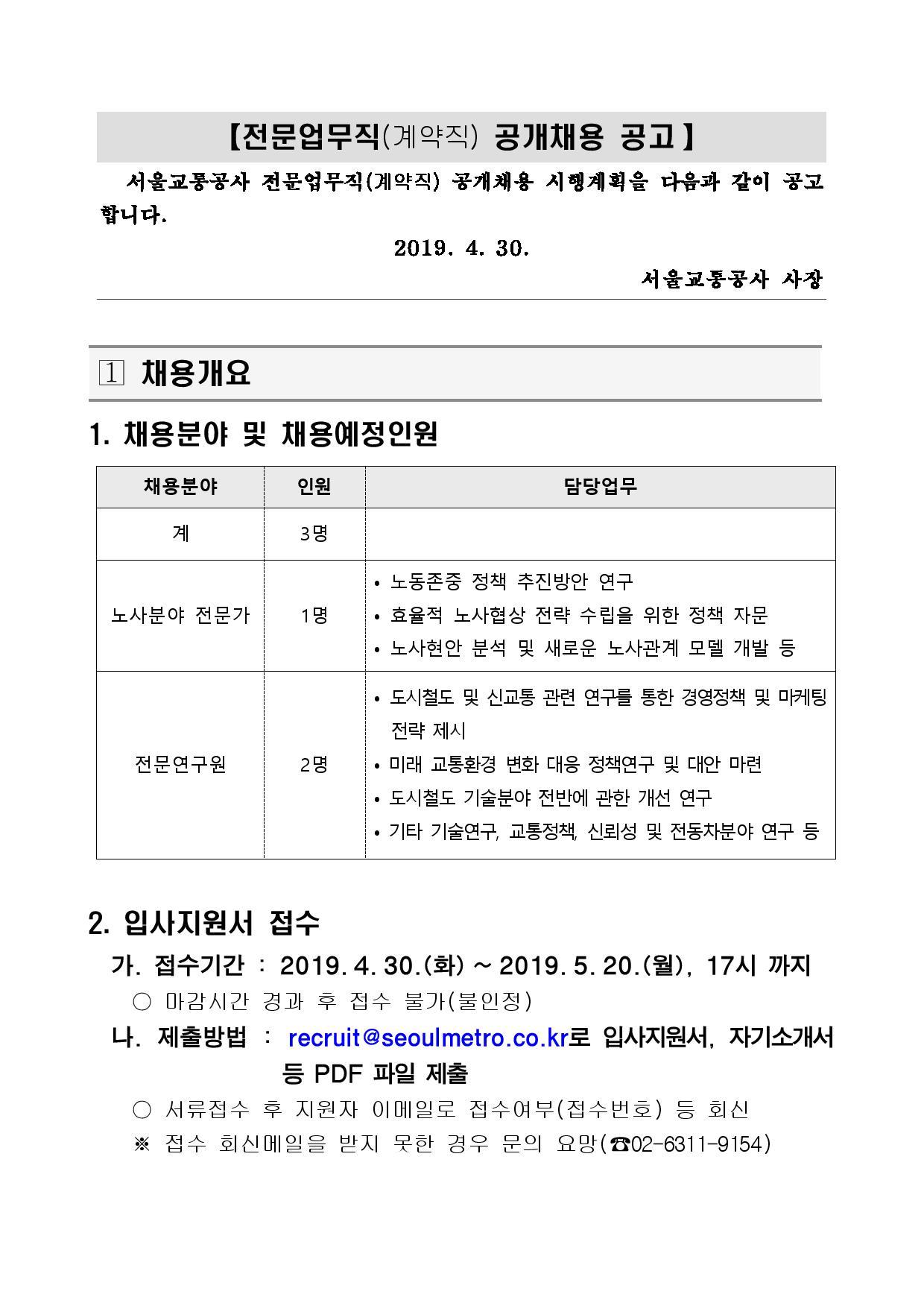 | 제목 | (~5/20)서울교통공사 전문업무직(계약직) 공개채용 안내 | ||||