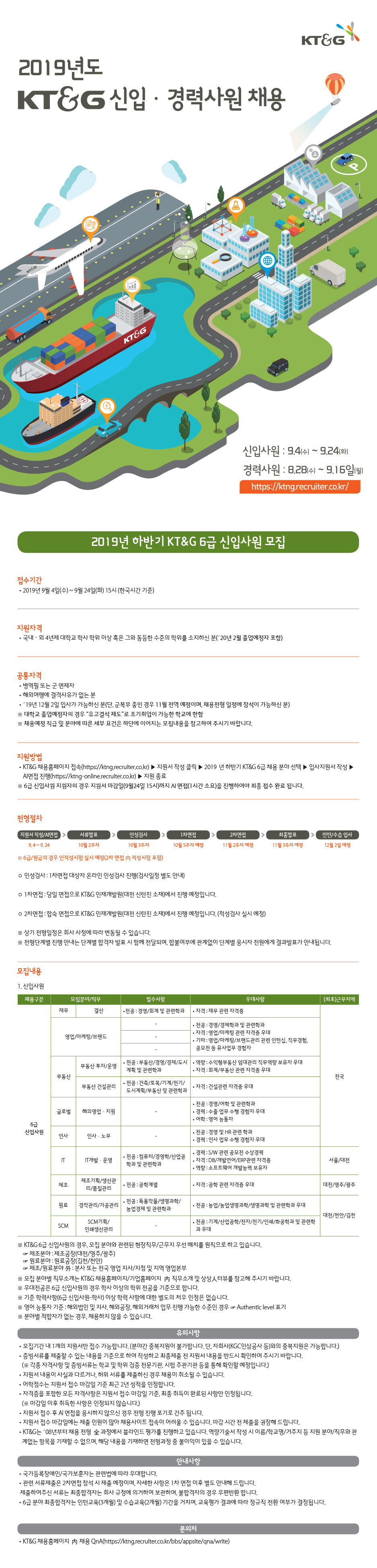 | 제목 | (~9/24)[KT&G] 2019년 하반기 6급/10급/원급 신입 채용안내 | ||||