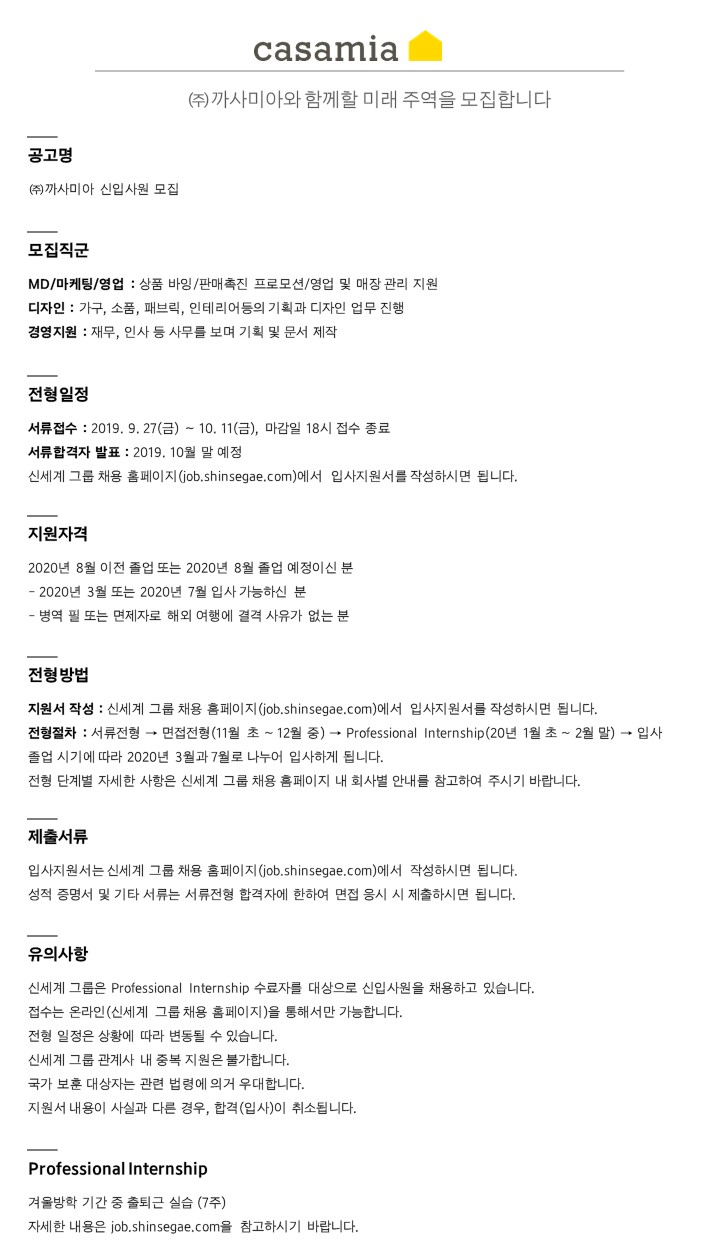 (~10/11) [까사미아] 2019 하반기 신입사원 채용 안내 글의 상세내용