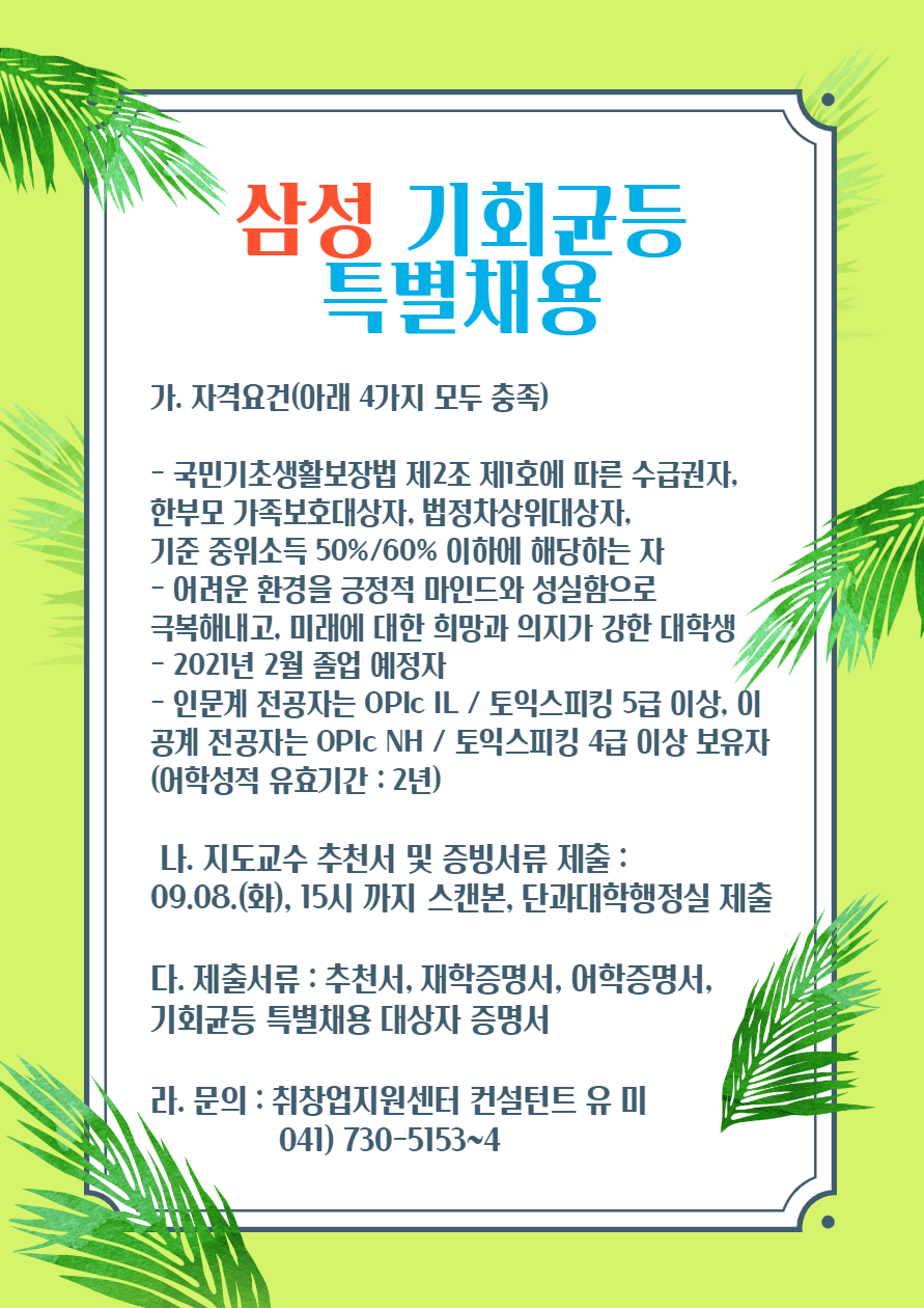자세한 내용은 취창업지원센터 041-730-5153~4에 연락바랍니다. |