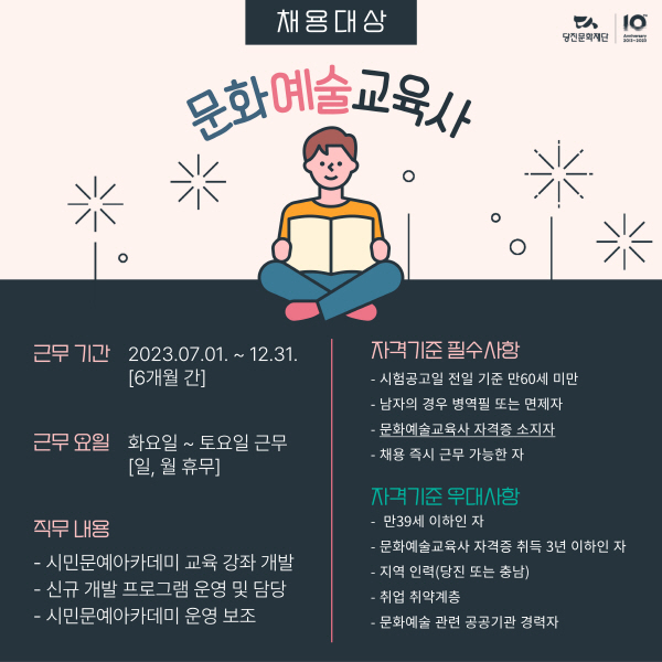 다. 공고기간 : 2023. 05. 31.(수) ~ 06. 20.(화) [21일간] 라. 접수기간 : 2023. 06. 15.(목) ~ 06. 20.(화) 09:00~18:00 [6일간] 마. 근무기간 : 2023. 07. 01.(토) ~ 12. 31.(일) 예정 [6개월간] ※ 일 8시간, 주 40시간 내 근무 바. 세부내용 : 붙임 및 홈페이지(당진문화재단-채용공고) 참조 사. 문 의 : (재)당진문화재단 예술교육부 ☎ 041-350-2933