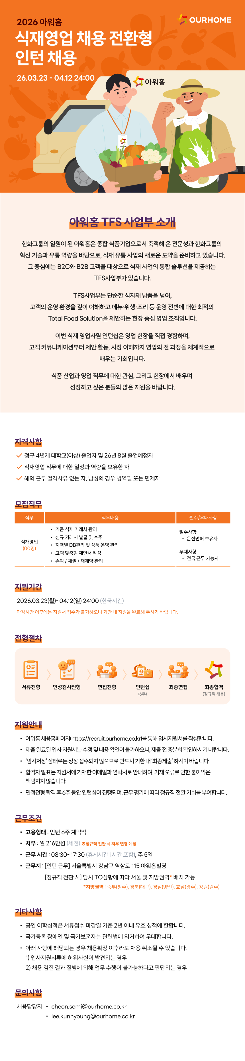 [아워홈] 2026 아워홈 식재영업 채용 전환형 인턴 채용 -모집기간: 26년