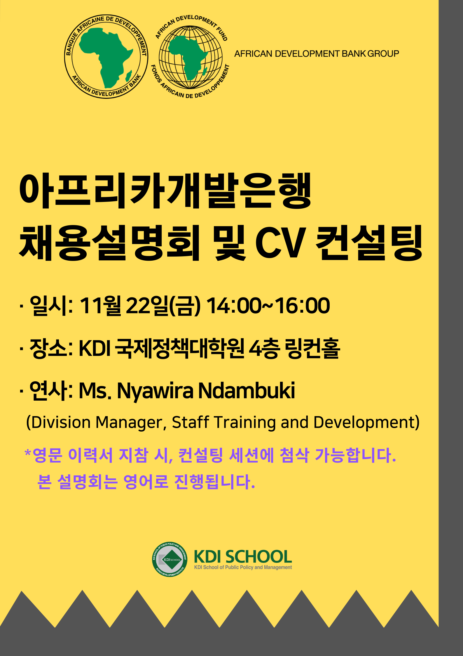 가. 행사 : 2019년 아프리카개발은행 세종·충청권 채용설명회 나. 일자 : 2019. 11.22(금) 다. 내용 : 14:00-15:00 채용설명회 진행 15:00-16:00 영문이력서 컨설팅 라. 장소 : KDI국제정책대학원 4층 링컨홀 (세종시 반곡동 소재) 마. 대상 : 세종·충청지역 대학(원)생, 경제인문사회연구회 산하 연구기관 소속 인턴 등 바. 비고 : 영문 이력서 지참 시 컨설팅 세션에 첨삭 가능. 본 설명회는 영어로 진행. 사. 참가비 : 무료