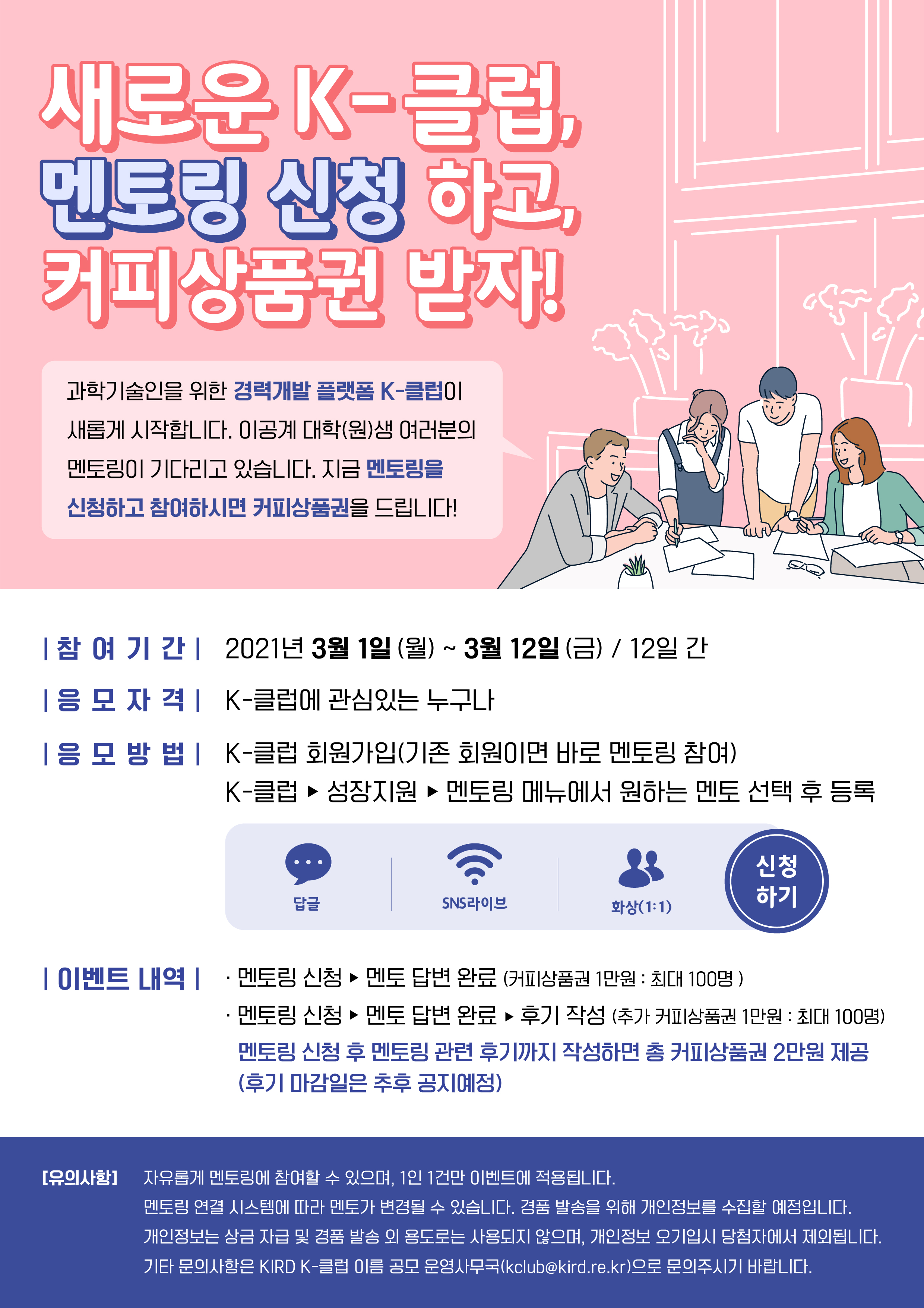 [K-클럽 온라인 멘토링] 가. 대 상 : 이공계 대학(원)생 및 취업준비자 나. 내 용 : KIRD 온라인 멘토링 참여(전문가 답글, SNS 라이브, 실시간 화상 3가지 방식 중 택1) 다. 주 제 : 진로․경력개발 관련 고민상담, 관심분야(취업, 창업, 연구) 정보습득 등 자세한 내용은 홈페이지(https://k-club.kird.re.kr) 확인하시기 바랍니다. 감사합니다.