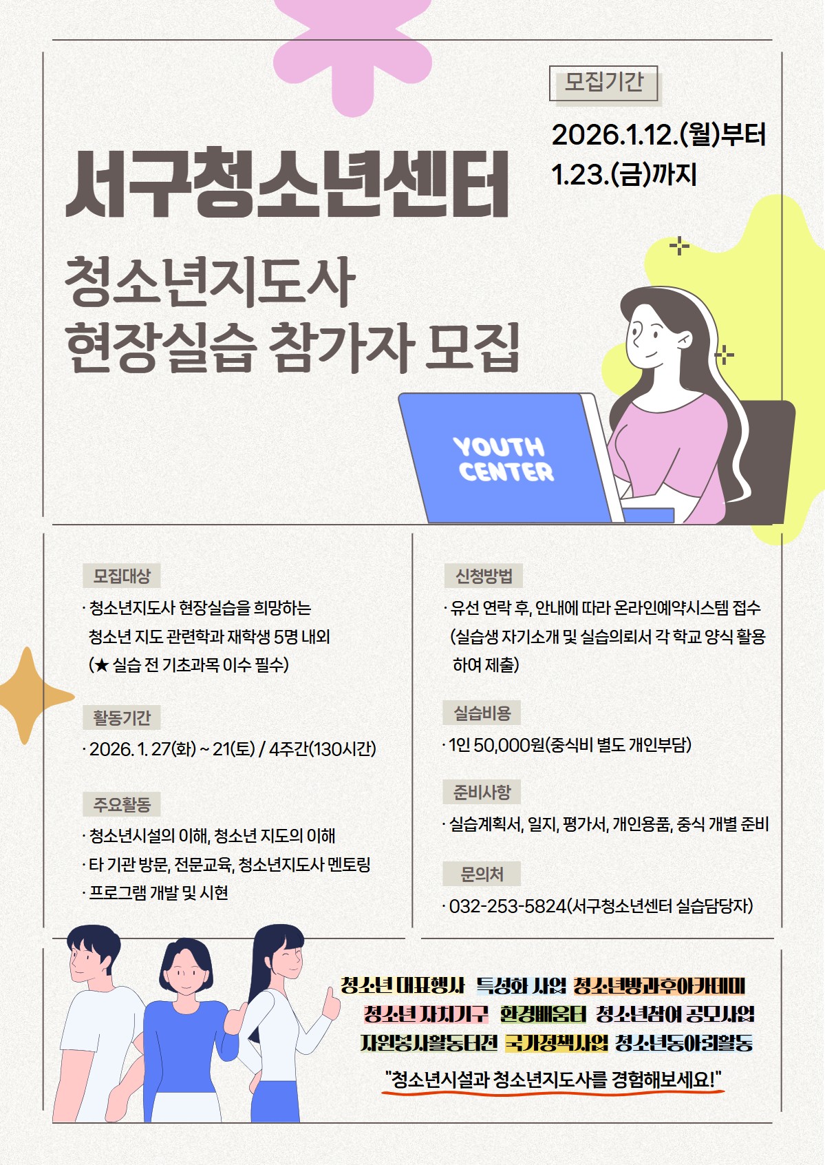 가. 실습기간 : 2026. 1. 27(화) ~ 2. 21(토) / 4주간(130시간) 나. 장 소 : 서구청소년센터 및 관내 일대 다. 인 원 : 청소년 관련 학과 재학생 5명 내외 라. 실습내용 : 청소년시설의 이해, 청소년지도의 이해, 타 기관방문, 전문교육 등 마. 실 습 비 : 1인 50,000원 바. 신청방법 : 유선 연락 후, 이메일 접수