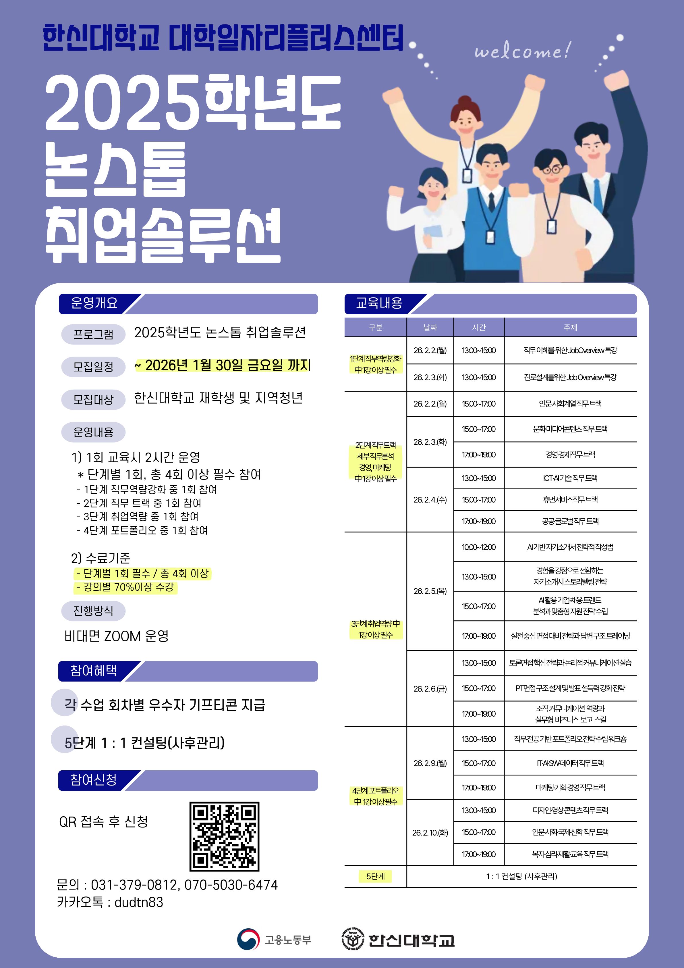 라. 주요내용 마. 모집기간: 2026.02.01(일) 18시까지 바. 신청방법: https://buly.kr/ChqGJtR (구글폼) 사. 문 의: 한신대학교 대학일자리플러스센터( Tel. 031-379-0812 )